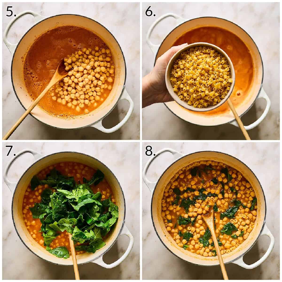 - Add the rest of the chickpeas and broth, bring to a boil.