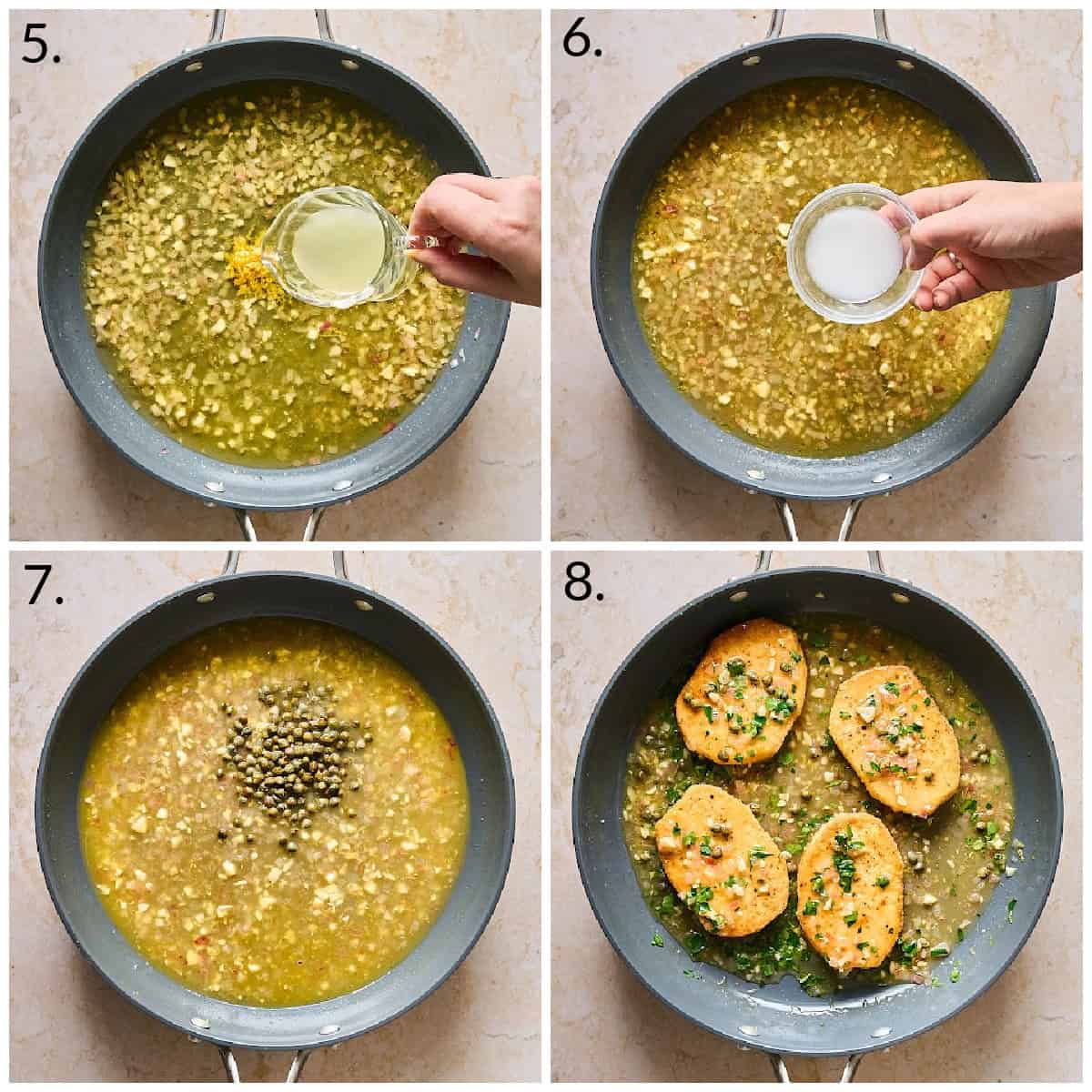 - Stir in the broth, lemon juice, and zest. Bring the sauce to a simmer and cook until slightly reduced, about 4-6 minutes.