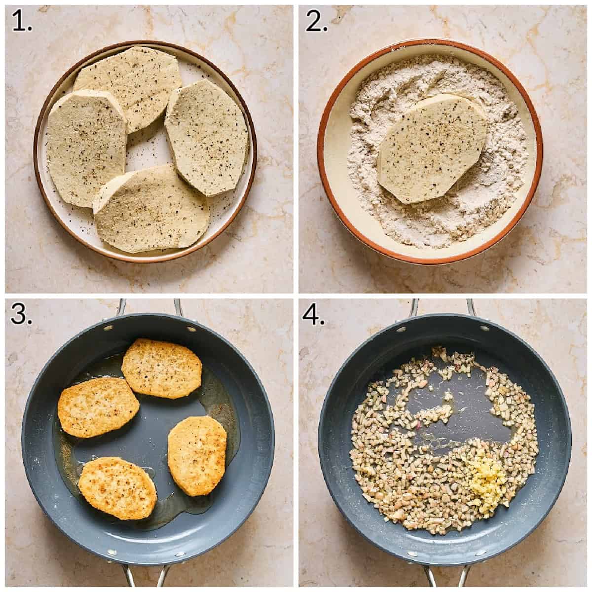 - Season both sides of the sliced tofu with salt and pepper. In a shallow bowl, whisk together the flour and 2 tablespoons of cornstarch. Dredge the tofu lightly, shaking off any excess coating. Set aside.
