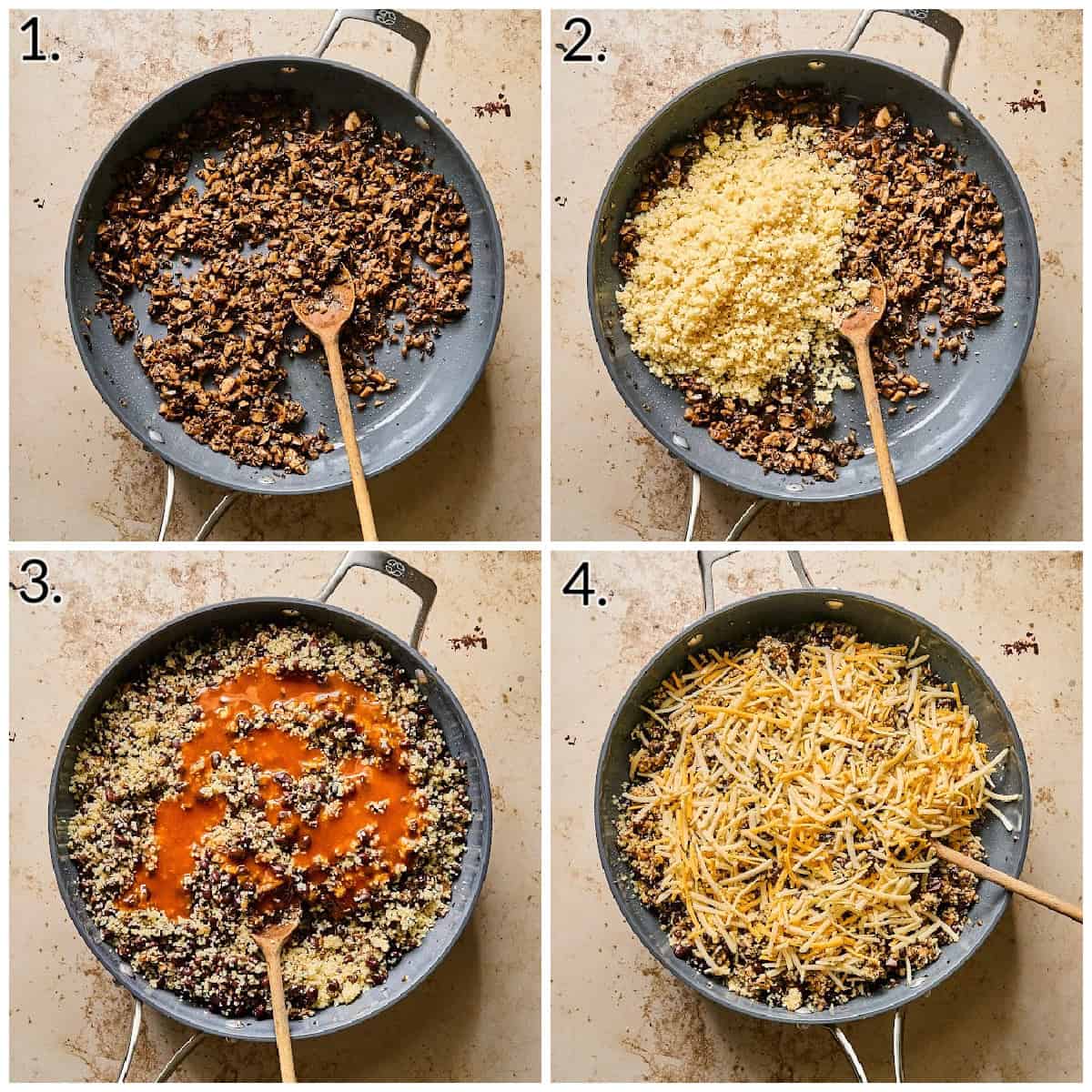 - Heat 1.5 tablespoons of oil in large pan over medium-high heat. Add onion and sauté until translucent. Add remaining oil, then the mushrooms, and season with salt/pepper. Sauté until golden and tender. Add garlic and sauté for 30-60 seconds. Now add the chili powder and cook for 30 seconds.